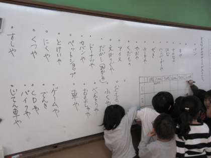 今日は,お店やさんの言葉を集めました。グループごとのお店を決めて,黒板に書きました。