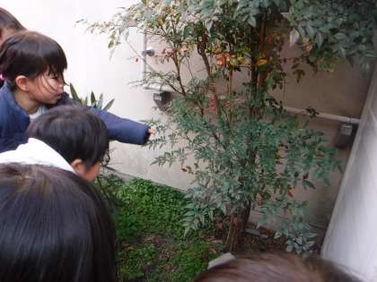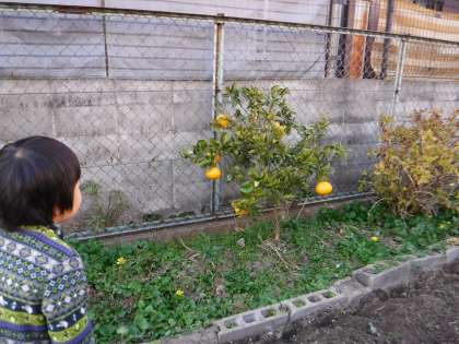 「あっ,先生,実がなってる!」「みかんもなってるで。」