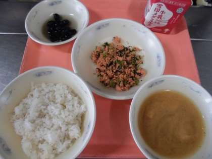 麦ごはん・牛乳・さけとだいこん葉のまぜごはん(具)・黒豆・みそ汁