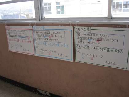 学習した割合についてしっかりと学ぶため,いつでも目に触れることができる廊下に大切なことを掲示しています。5年生にとっては,まだまだ慣れない割合の学習ですが,今後もよく使うことになるので,確実に身に付くことができるよう頑張っています。