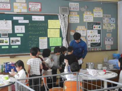 おかずのおかわりにはたくさんの子どもたちが並んでいました。