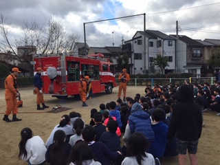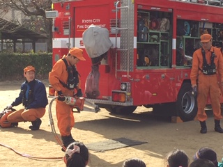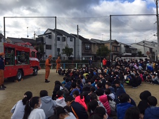 学校長とレスキュー隊の方から避難訓練の講評をしていただき,最後は救助車の装備のことについて,レスキュー隊の方から話をしていただきました。