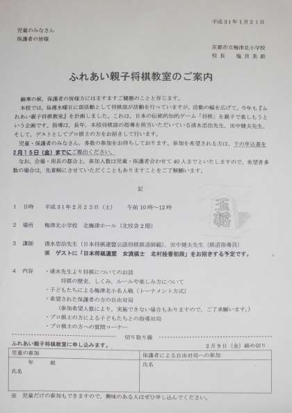 2月23日(土)に例年行っている「ふれあい親子将棋大会」を行います。子どもたち、保護者の皆様どなたでも参加していただけます。多数のご参加をお待ちしています。