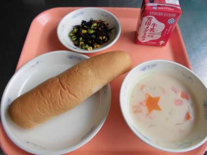 味付けコッペパン・牛乳・豆乳のクリームシチュー・ひじきのソテー