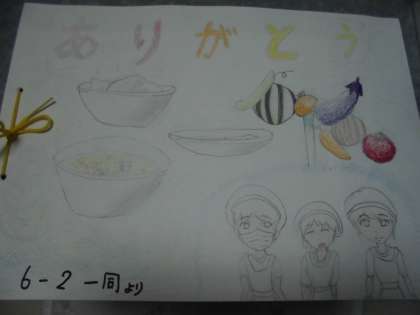 6年2組の皆からは、「6年間、美味しい給食をありがとうございました。」と、それぞれが書いてくれた手紙を持ってきてくれました。6年間の給食の思い出・ランチルームで一緒に食べたこと、感謝の気持ちなどを書いてくれていて、とっても嬉しかったです。