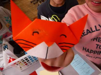 朝,いつものように自主学習のノートや家で制作してきたものを見せてもらっていると,ねこの折り紙を出されて,おもむろに指にはめ始めた子がいました。