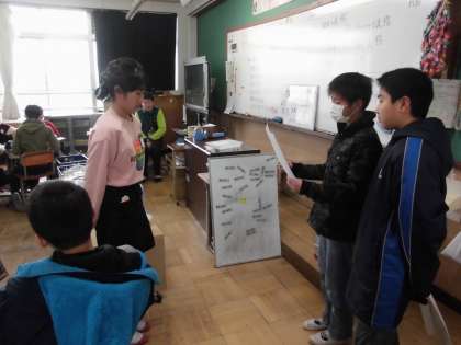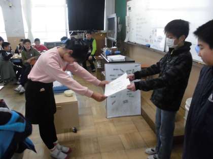 先週金曜日に行った豆つまみ大会で優勝した6年2組に、給食委員会より表彰状を渡しました。