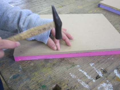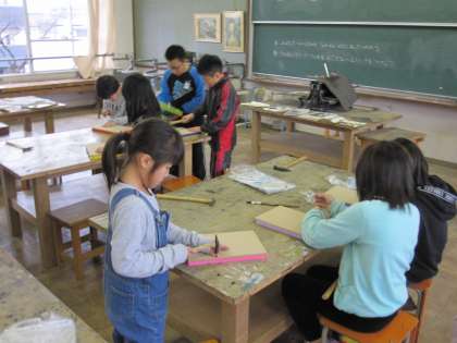 図工室でくぎを打ったり,教室で絵の具をぬったりして,作品を作っています。くぎがまっすぐになるように慎重に打っています。