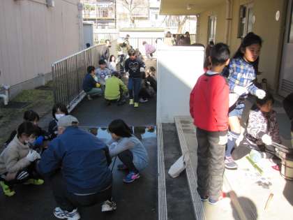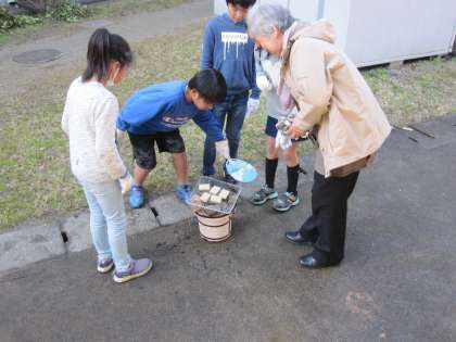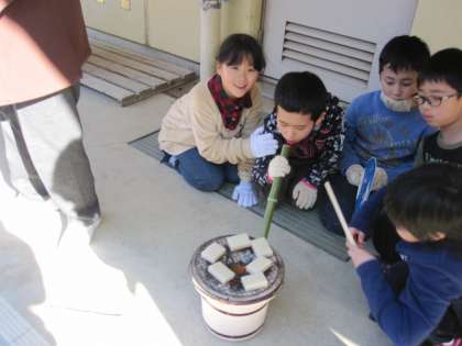 おもちを焼くときに,竹筒を使って七輪の火に勢いをつけていました。火が強すぎて,おもちは少し焦げるところがありましたが,子どもたちはおもちを喜んで食べていました。