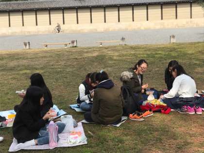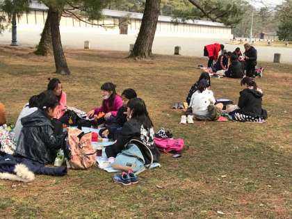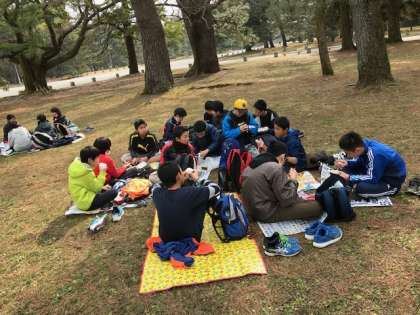 建礼門の前でご飯を食べています。特に困りごともないようです。ほとんどの班が到着しています。