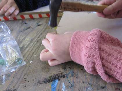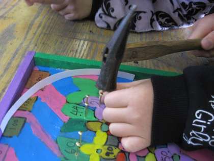 板に絵を描き,玉が転がる間隔を考えながらくぎを打っています。くぎがまっすぐになるようにしっかり手をそえて,打つことができていました。