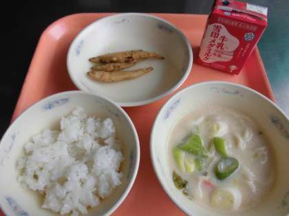 減量ごはん・牛乳・わかさぎのこはくあげ・豆乳鍋(うどん入り)