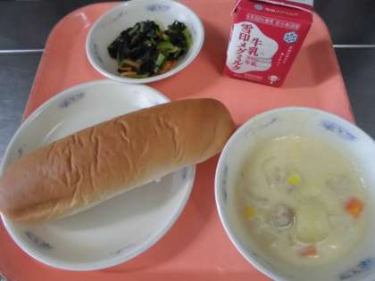 味付けコッペパン・牛乳・コーンのクリームシチュー・小松菜のソテー