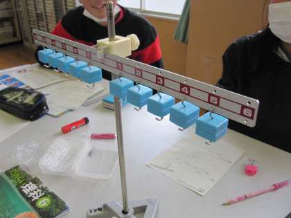 てこのうでがつりあうときを調べました。子どもたちは,重さ×支点のきょりが,両方のうでで同じ時につりあうことを見つけていました。