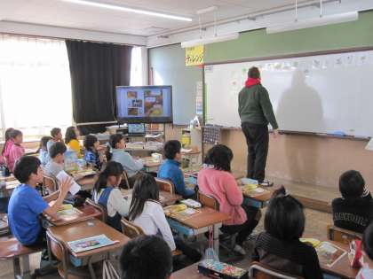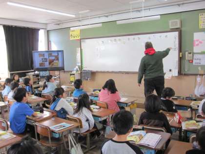 ALTのロバート先生に,教材のお話を一緒に読んでもらいました。子どもたちは,たくさんの英語を耳で聞いて,一緒に発音して楽しみました。