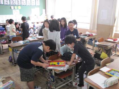 作品をお互いに鑑賞し,それぞれが工夫した良さを伝え合いました。考えて工夫した作品を楽しみながら,友達の作品の良さを感じ取っていました。