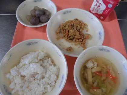 麦ごはん・牛乳・おからそぼろ丼(具)・里いもとこんにゃくの土佐煮・キャベツの吉野汁
