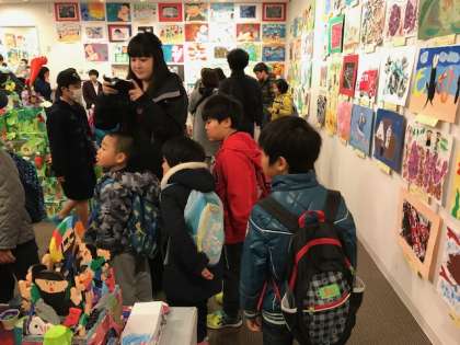 堀川御池ギャラリーで開催中の「小さな巨匠展」の鑑賞に行きました。子どもたちの「鬼」をテーマにした紙版画や右南支部の合同立体作品「それいけ!わくわくタウン」の力作を見ました。梅津中学校からのお友達とも出会い,仲良く鑑賞しました。