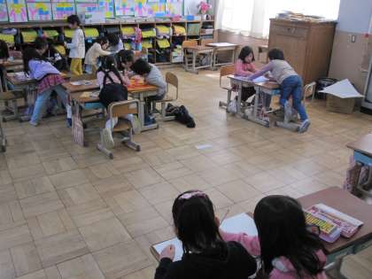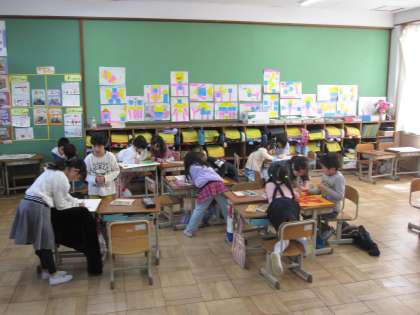 1年生を迎えるにあたって,お迎えの言葉の準備をしています。グループごとに絵をかいたり,言葉を考えたりしました。