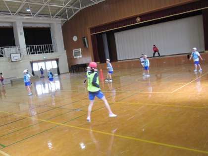 グループで対戦するおにごっこゲームをしました。相手側の宝を取りあって点数を競うゲームです。タッチされずに相手の宝を取ることができるように逃げたり,自分の宝がとられないように守ったりして走り回りました。