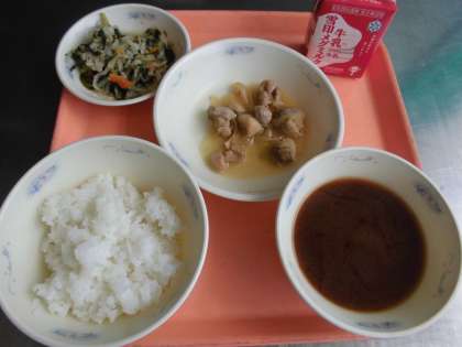 ごはん・牛乳・鶏肉のあまから煮・切干大根のごま煮・赤だし