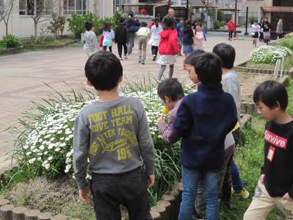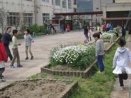 春の様子を校内で探しました。たくさんの花の中にチューリップが可愛らしく咲いているのを見つけていました。