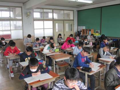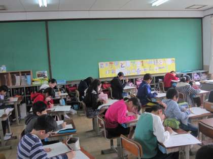 算数の練習問題に取り組んでいます。プリントを通して,いろいろな問題を解きました。