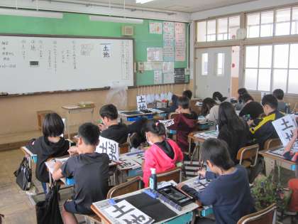 「土地」の書き方のポイントを確認し,筆を立てて丁寧に書きました。よく見てしっかりと書くことができていました。
