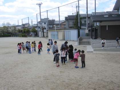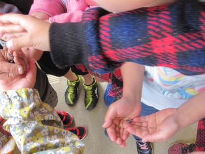 今日は運動場に出て,春の生き物を探しました。かえるなどを見つけていました。枯れ葉の下にいたダンゴムシを見せてくれました。