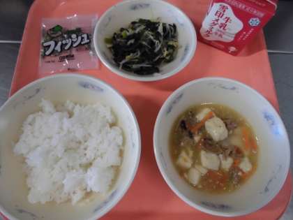 子どもたちから、「『五目どうふ』とってもおいしくて、いっぱいおかわりしました。『ほうれん草ともやしのいためナムル』は、お酢の味でさっばりしていて、美味しかったです。」と、感想をくれました。