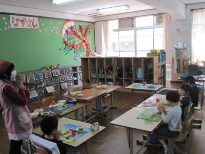 6年生が準備を手伝いました。しっかりと待って,いただきますをしました。好きな食べ物をたくさん話してくれました。