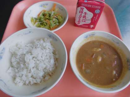 一年生には、入学して初めてのカレーになります。カレーは、給食室でルーから手作りしています。手作りのルーを味わって食べました。