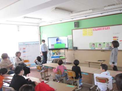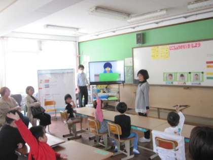 パソコンを使って,だれなのかをみんなで考えて,自己紹介をしました。少しのヒントで子どもたちは誰なのかをあてていました。