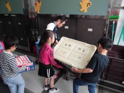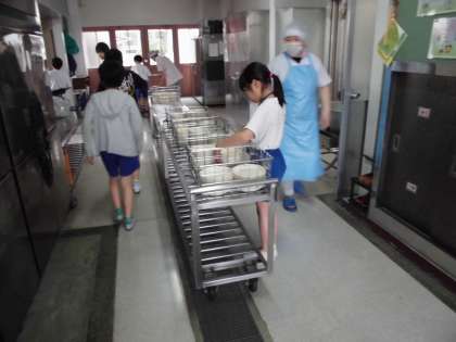 パン・ごはん,食器,牛乳の場所に分かれて,活動します。今日の当番は二人だったので,パン箱と食器についてくれました。