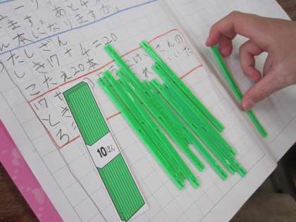 17+3の学習をした後,17+4の計算の仕方について考えました。10のかたまりを作って,のこった1と合わせて,答えを出していました。操作を大切にして学習を進めています。