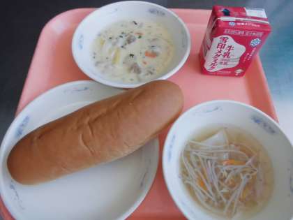子どもたちから、「『チキンとペンネのクリーム煮』は、ペンネがモチモチしていて、美味しかったです。グラタンみたいでおいしかったです。『スープ』は、スープの味が野菜にしみ込んでいて、もやしがシャキシャキしていて美味しかったです。」と、感想をくれました。