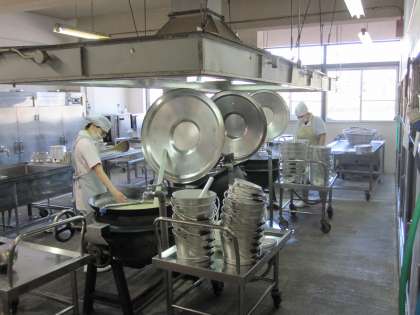 給食室の様子 新献立メニュー「チキンとペンネのクリーム煮」