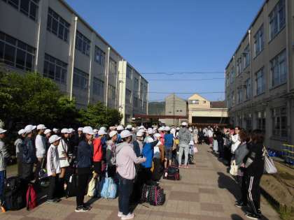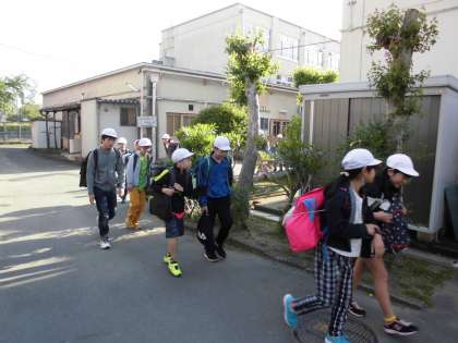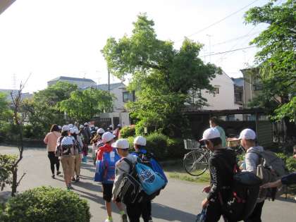 見送りに来ていただいたお家の人に「いってきます」のあいさつをして,元気よく子どもたちは学校を出発しました。