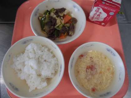 子どもたちから、「『焼肉』は、肉がやわらかく、野菜と一緒に食べたら、とっても美味しかったです。『トマトと卵のスープ』は、トマトが甘くて、卵がとろとろで美味しかったです。また、食べたいです。」と、感想をくれました。