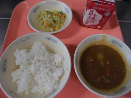 『カレー』は、牛肉・玉ねぎ・人参・じゃがいもを煮、給食室で作った手づくりのカレールーを加えて、トマトピューレ・フルーツチャツネ・バーベキューソース・ウスターソース・塩・こしょう・醤油・オールスパイス・ヨーグルトで調味して、じっくり煮込んで仕上げました。