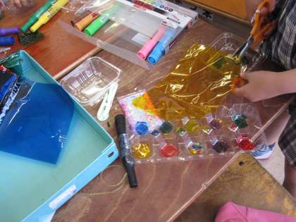 セロファンをつかったり,模様も描いてみたりして,光に通すとどのようになるのか確かめながら,活動しました。