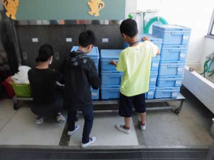 今日は和献立のため、牛乳はありません。パン箱と食器についてくれました。新しいメンバーでの活動も1か月を過ぎ、てきぱきと整理整頓しています。