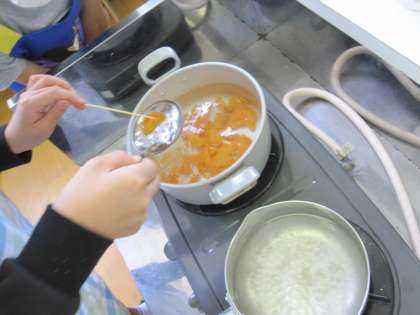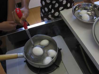 火がしっかりと通っているかたしかめたり,ゆであがった卵をむいたりしました。