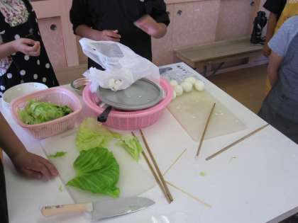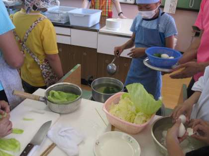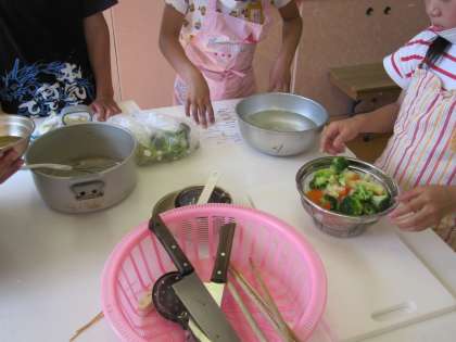 野菜をしっかりとゆでて,分量を確認しながらドレッシングを作りました。