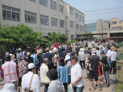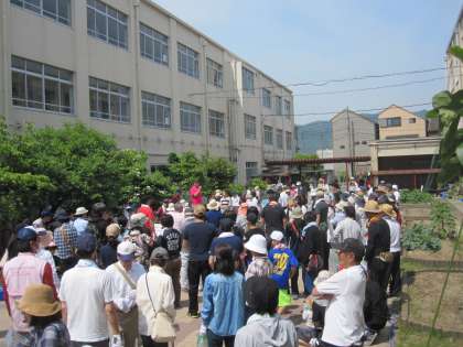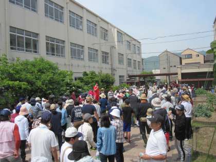 地域,各種団体,PTAの方々,子どもたちで,有栖川清掃が行われました。初めに自治会連合会会長,学校長,PTA会長からのあいさつがありました。