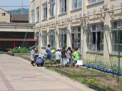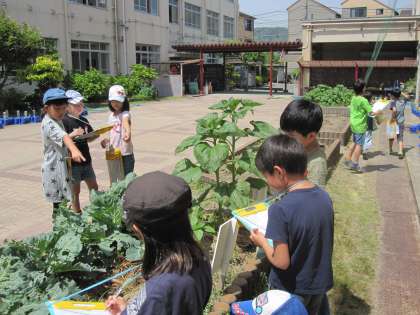 植物の生長を観察しています。気温がとても高くなり,植物が大きく生長しています。