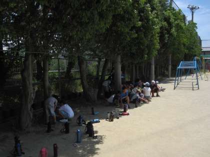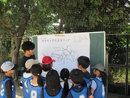 待っている間は,日陰で休み,学校の安全マップに危険なところをシールで貼りました。