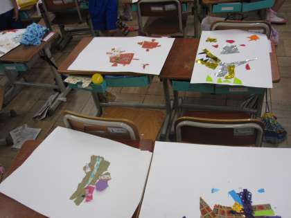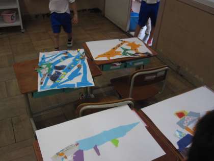 やぶいた形からたくさん想像をして,作品を作り上げました。楽しい作品ができあがってきています。