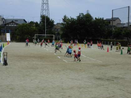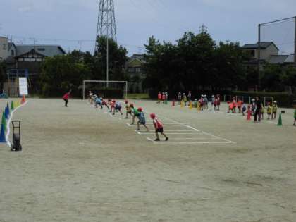 2年生のおりかえしリレーでは,後ろから走ってくる仲間のバトンをもらう方法を考えながら競走していました。