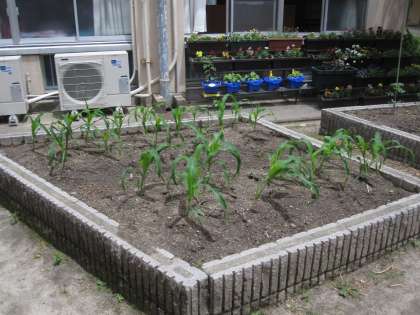 トウモロコシが大きく育ってきました。なすびは,実をつけだしました。